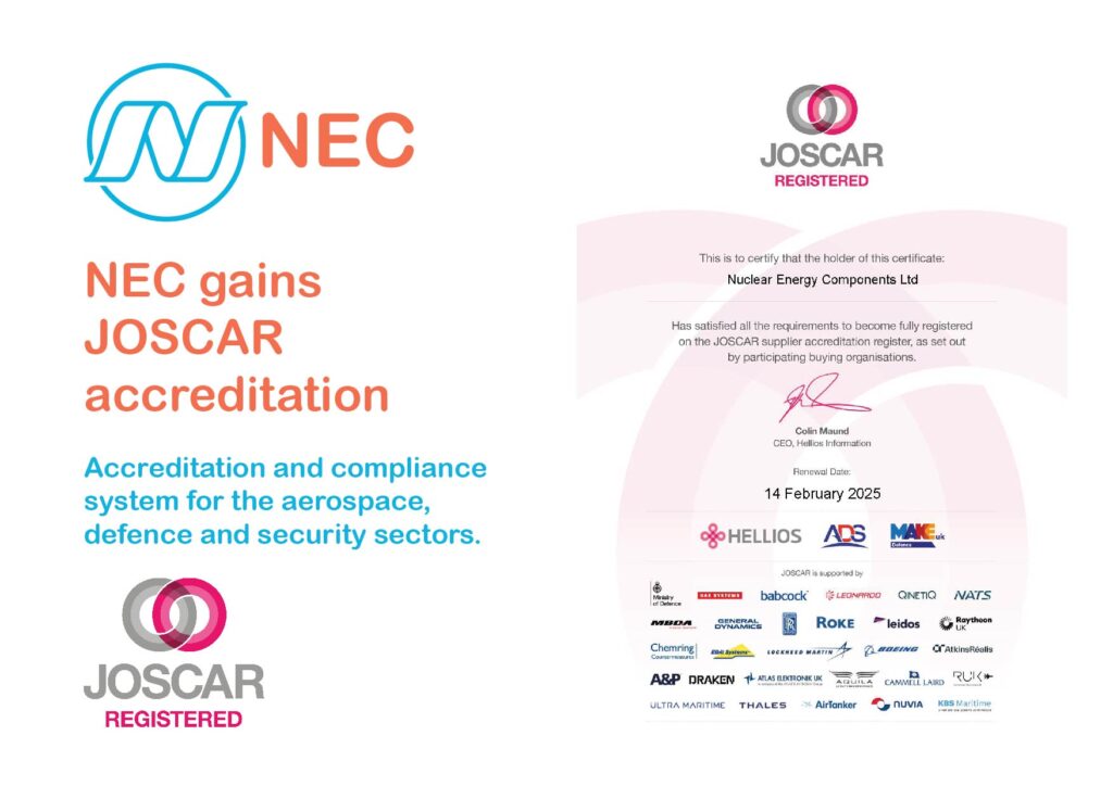 Nuclear Energy Components (NEC) has added to its accreditations by gaining JOSCAR accreditation with Hellios Information. JOSCAR is the accreditation and compliance system for the defence, aerospace and security sectors including prime contractors, civil aviation and security which acts as a single repository for pre-qualification and compliance information for prime contractors such as BAE Systems, Babcock, Boeing, Lockheed Martin and Rolls-Royce.